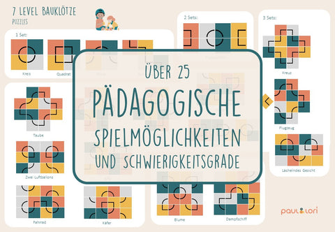Durch die “7 Level Bauklötze” üben Kinder viele motorische und kognitive Fähigkeiten wie Aufheben, Stapeln, Ursache-Wirkung, Gravitation, Farben & Formen, Kreativität, Reihenfolgen, Gegensätze und Zusammenhänge. Von einfach bis schwierig: Durch 7 Level unterschiedlicher Schwierigkeitsgrade könnt ihr einfache, fortgeschrittene und komplexe Puzzle anhand der Farblinien auf den Holzbauklötzen entdecken. Ein Spielzeug, das mit deinem Kind mitwächst - von 1 bis 6 Jahren bieten sich euch immer neue herausfordernde Spielmöglichkeiten!