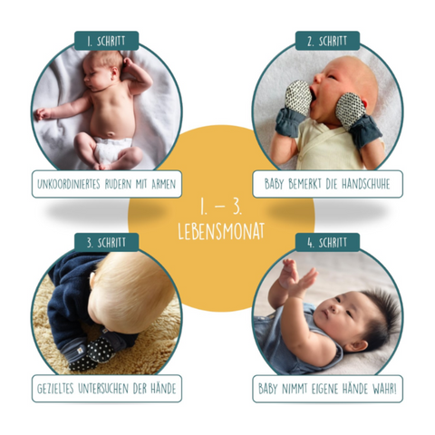 1. Körperwahrnehmung: Da Babys in den ersten Lebenswochen Farben noch nicht so gut sehen können, begeistern vor allem deutliche schwarz-weiß Kontraste dein Schatz von Geburt an. Dazu muss dein Baby erst noch den eigenen Körper kennenlernen und wahrnehmen lernen. Beginnen wird dieser Prozess mit dem Kennenlernen der eigenen Hände. Durch die Handschuhe mit Kontrastmuster lenken wir gezielt die Aufmerksamkeit deines Babys auf die eigenen Hände und unterstützen so bei der Körperwahrnehmung.