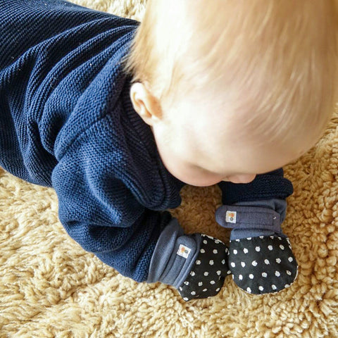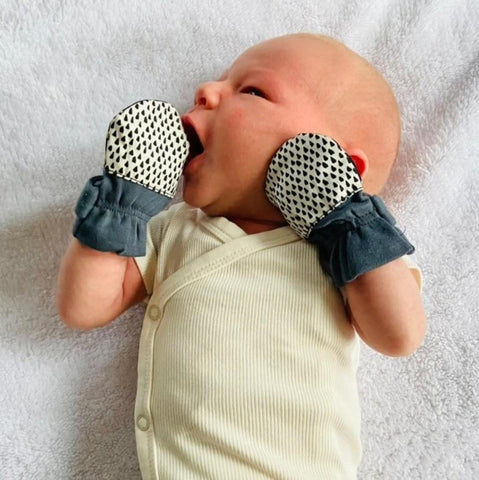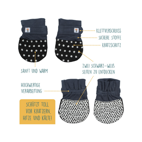 Da man die Nägel nicht von Geburt an schneiden sollte, sind Kratzfäustlinge hilfreich, damit dein Baby sich nicht aus Versehen im Gesicht kratzt. Gerade wenn sie hungrig sind, reiben sich Babys oft mit den Händen im Gesicht. Das schwarz-weiß Muster unserer Fäustlinge zieht außerdem die Blicke deines Babys nahezu magisch an und unterstützt Selbstwahrnehmung und Entdeckung der eigenen Hände. Unsere Paul & Lori Kontrastfäustlinge bieten deinem Baby somit drei Dinge gleichzeitig: