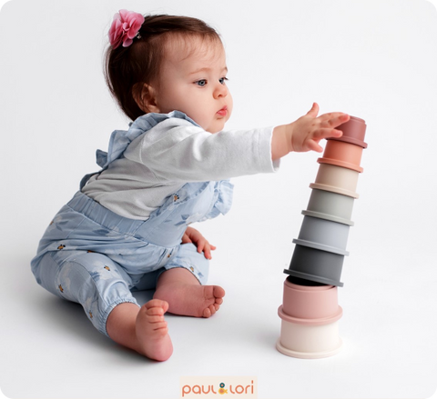 Gleichgewicht & Gravitation: Zum Verstehen von Gleichgewicht und Gravitation hilft nicht nur das aufeinander Stapeln, sondern natürlich genauso das Umwerfen von gebauten Stapelbecher-Türmen. Stapelt einen Turm mit allen Bechern und erforsche mit deinem Baby wie alles zusammenstürzt, wenn man den Turm zum wackeln bringt. Bleibe geduldig und lass dein Baby ruhig Erfahrungen mit dem Umwerfen der Stapelbecher sammeln. Umwerfen ist für dein Baby zunächst einfacher wie das aufbauen. Schafft es dein Baby motorisch schon ein paar Becher zu stapeln? Das muss erst geübt werden und erfordert eine ganze Menge Geschick und Konzentration!