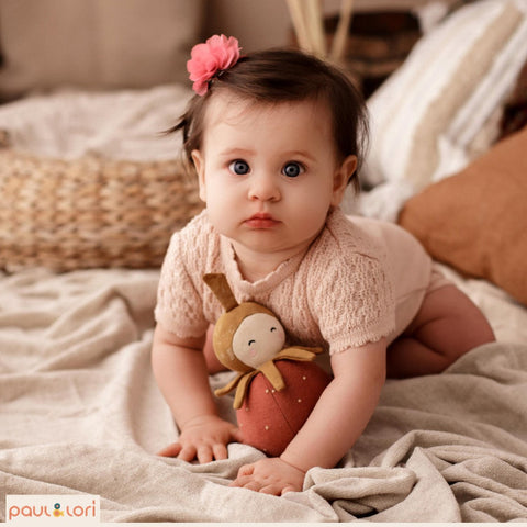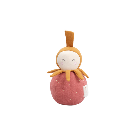 Das Stehaufmännchen Erdbeere kombiniert perfekt alle diese Bereiche. Die Kuhglocke im Innern des Babyspielzeugs macht rhythmisch “Kling-Klang” bei Bewegung und wenn man sie anstupst, fällt die Steh-auf-Erdeebere zur Seite, richtet sich jedoch direkt wieder auf. Ein wirklich spannendes und sonderbares Verhalten, das dein Baby mit Sicherheit ganz genau untersuchen will!